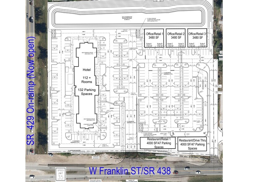 Hôtel, restaurant, commerce de détail, bureau, emplacement privilégié - Façades complètes sur l'autoroute 429 et la SR 438 (ouest de la rue Franklin). Excellent emplacement à quelques minutes du centre-ville de Winter Garden. Façades de signalisation 429 de l'autoroute.