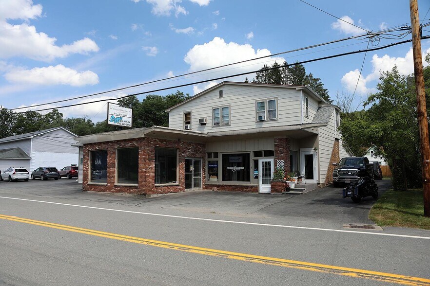 Commercial building approximately 6,896 Sq.Ft with large, level, and paved loading access to State Highway Route 52. Located in Jeffersonville, NY, building offers 3 commercial units plus 1 residential apartment. Unit 1 is currently used as an auto body repair/painting shop. Unit 2 is an insurance office. Unit 3 is a vacant store front. Unit 4 is the second floor residential 3 bedroom 1 bath apartment. Apartment has a nice sunporch to enjoy outdoor entertainment. Building has been nicely updated with newer roof, exterior painting and heating units. High visibility here, as NY State Route 52 is the access and the Village of Jeffersonville is one quarter mile away. This is a real estate only offering, but the auto body repair shop has been in this location for decades and is available for an additional sale. Set in the heart of the Western Sullivan Catskills, 2 hours from New York City, level paved access for unloading large trucks, lots of parking-the commercial potential is endless!