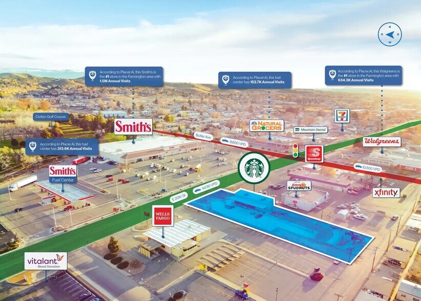 Strategically located across from Farmington High School and adjacent to Smith’s Grocery and Wells Fargo, the site benefits from strong co-tenancy and high visibility. The surrounding trade area is anchored by top-performing retailers including Walgreens and Dollar General, each ranking #1 in local foot traffic according to Placer.ai. Traffic counts exceed 14,000 VPD on nearby corridors, reinforcing the site’s accessibility and exposure.