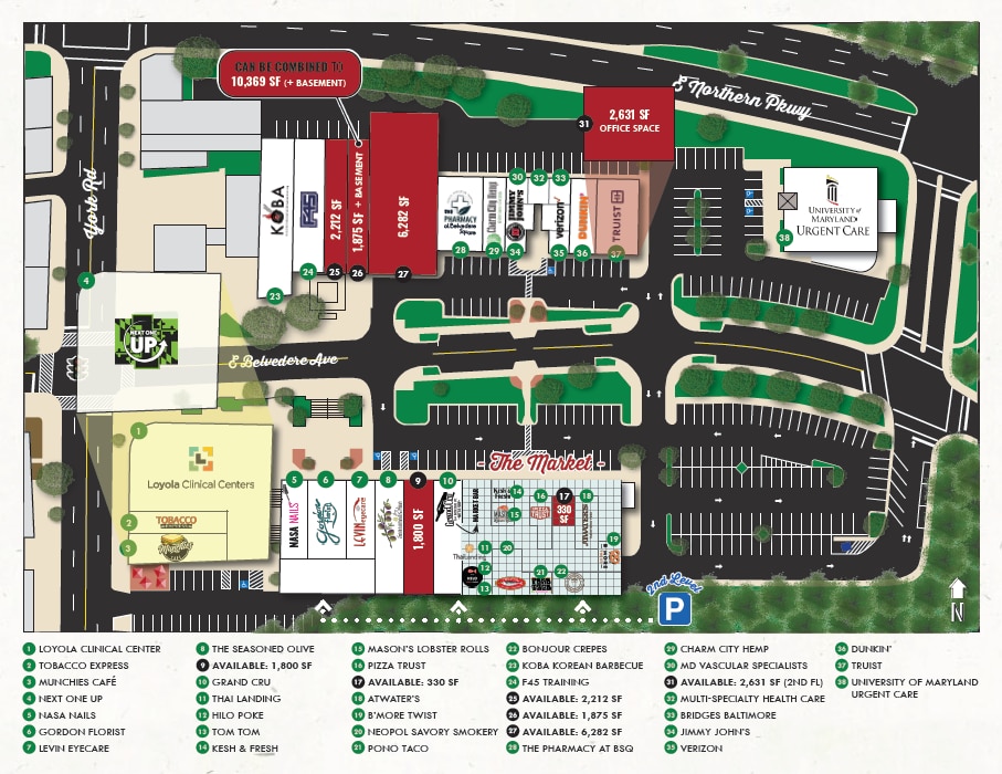 Bienvenue à Belvédère Square... un endroit à nulle autre pareille. En tant que lieu de rassemblement central de North Baltimore, la place Belvedere se trouve à la croisée des chemins. Situé à l'angle sud-est très fréquenté et très visible de York Road et Northern Parkway dans la ville de Baltimore, le Belvedere Square offre un mélange dynamique de magasins de détail, de restaurants et d'options de service pratiques. Au total, le centre offre plus de 110 000 pieds carrés de vêtements de mode, de chaussures, d'ameublement, de restaurants et de services quotidiens, et un marché frais sans pareil. Belvedere Square est idéalement situé en face du célèbre Senator Theatre de Baltimore, et se trouve également à proximité de Clark Burger, M&T Bank, Zen West, Giant Food, Petco, Panera Bread, Rite aid, Staples, Advance Auto Parts, Chipotle, Walgreens, Boston Market, Qdoba, Zoë's Kitchen, Wendy's et plus encore !