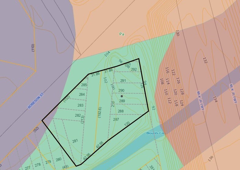 Deux parcelles adjacentes de terrain industriel lourd situées sur la rue Robeson, offrant 278 pieds de façade sur la route et une grande visibilité avec 32 000 véhicules passant quotidiennement (NCDOT).