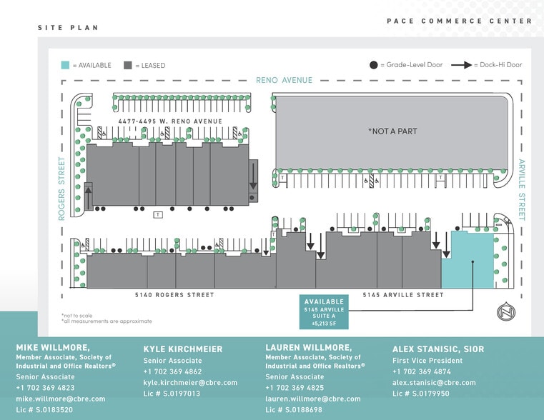 Pace Commerce Center propose des espaces de bureau/entrepôt/salle d'exposition avec une façade sur l'avenue Reno et la rue Arville. La propriété est située dans le sous-marché du sud-ouest, juste au sud de l'avenue Tropicana, à l'intersection de l'avenue West Reno et de la rue Rogers. Cet emplacement central offre un excellent accès au Strip, à l'I-15 via Tropicana, à l'UNLV, à l'échangeur I-15/I-215, et est entouré de nombreux commerces de détail et services. Pace Commerce Center est un projet multi-locataires d'environ ±61 169 pi², composé de trois bâtiments sur ±3,34 acres. Les caractéristiques de la propriété incluent des quais de chargement au niveau du sol, un accès par quai pour certaines unités, des espaces de bureau climatisés et un stationnement abondant. Les propriétaires sont agréables à travailler avec et enthousiastes à l'idée de louer les espaces disponibles. Pour plus d'informations ou pour planifier une visite, contactez Mike Willmore au 702-369-4823 ou Lauren Willmore au 702-369-4825.