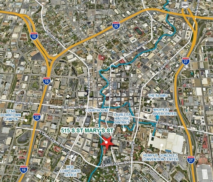 Le 515 rue S. Saint Mary's est un immeuble de bureaux de deux étages avec un sous-sol complet construit en 1935, d'une superficie de ±33 420 pieds carrés et situé sur une superficie de ±2,864 acres. Il est situé au centre-ville de San Antonio. La propriété repose sur la célèbre rivière San Antonio.