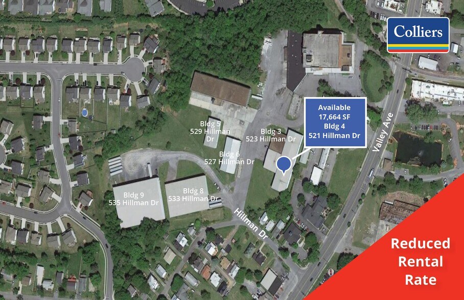 Bldg. 4 (521 Hillman Drive) is one of the buildings at 1955 Valley Avenue, a 17.35 acre site, zoned M-1 and B-2, just south of downtown Winchester. The property is situated directly on Valley Avenue and Hillman Drive, providing flexible access and multiple entry points.