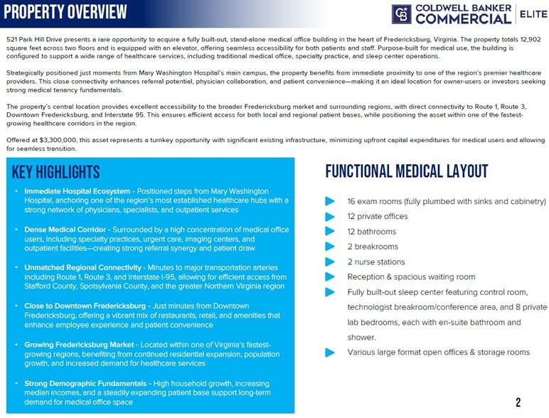 521 Park Hill Drive presents a rare opportunity to acquire a fully built-out, stand-alone medical office building in the heart of Fredericksburg, Virginia. The property totals 12,902 square feet across two floors and is equipped with an elevator, offering seamless accessibility for both patients and staff. Purpose-built for medical use, the building is configured to support a wide range of healthcare services, including traditional medical office, specialty practice, and sleep center operations.