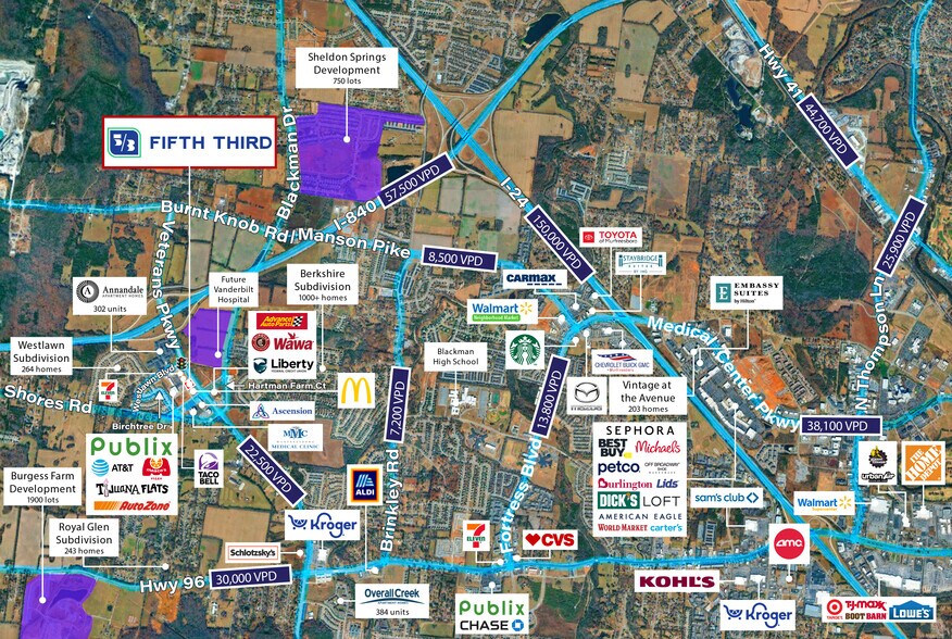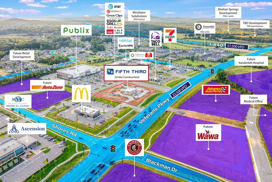 Strategically positioned in front of a brand-new Publix supermarket and adjacent to McDonald’s, Taco Bell, 7-Eleven, AutoZone, and Wawa, the property also benefits from direct visibility across from the future Vanderbilt Hospital—a major forthcoming medical hub. Fifth Third occupies a newly constructed building on a large 1.48-acre parcel along Veterans Parkway, just off the I-840 interchange, where traffic counts exceed 57,500 vehicles per day on I-840 and 22,500 vehicles per day on Veterans Parkway. The property offers excellent visibility, access, and exposure within one of Murfreesboro’s fastest-growing commercial corridors, supported by robust residential, retail, and medical development activity.
