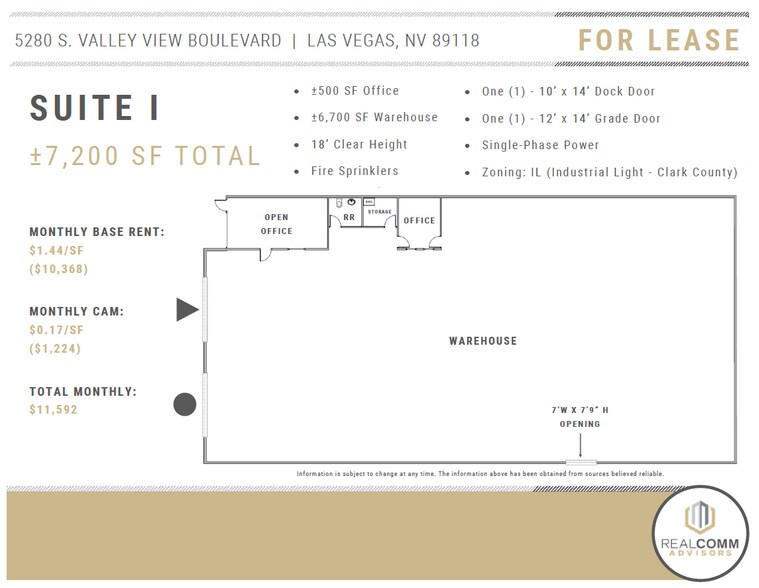 Monthly Base Rent - $1.44/SF + Monthly NNN Fee - $0.17/SF = $11,592 Total Monthly 7,200 SF Total and includes 500 SF of Office Space, 6,700 SF Warehouse w/ One (1) - 10' x 14' Dock Door, One (1) - 12' x 14' Grade Door, 18' Clear Height, and Fire Sprinklers. Can be combined w/ Suite J (5,280 SF) equaling a Total of 12,480 SF. (Suite K - 5,280 SF, may also be available for a combined SF of 17,760)