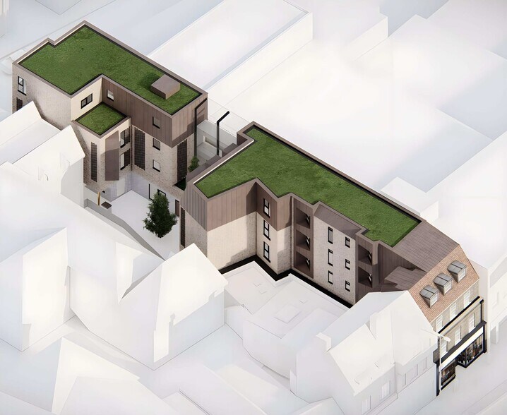 Block A fronts High Street and overlooks a courtyard/ It comprises 8 apartments and a ground-floor retail unit.