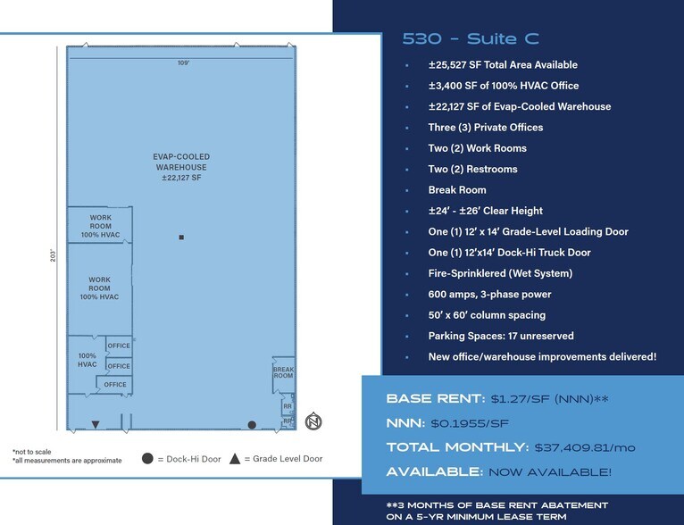 SPECIAL INCENTIVES AVAILABLE - Bldg 530 Suite C is a ±25,527 SF Industrial Unit featuring ±3,400 SF of office space, ±22,127 SF of warehouse space, six (6) private offices, two (2) restrooms, break room, 24’ - 26’ clearance, one (1) 9’ x 10’ dock-hi loading door, one (1) 12’ x 14’ grade-level loading door, fire-sprinklered (wet system), and ±600 amps, 277/480v, 3-phase power. LEASE RATE: $1.27/SF (NNN); NNN: $0.1955/SF; TOTAL MONTHLY: $37,409.81/mo. For more information or to schedule a tour please contact Lauren Willmore at 702-369-4825 or Kyle Kirchmeier at 702-369-4862.