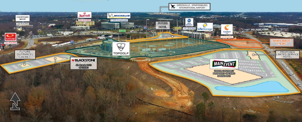 Aménagement de divertissement et d'utilisation mixte de 50 acres sur l'autoroute I-85 et le chemin Pelham à Greenville, en Caroline du Sud Ancré par Top Golf (MAINTENANT OUVERT) et le Main Event Entertainment Complex, Blackstone Shooting Sports propose l'ouverture en 2023. Visibilité incroyable du nombre le plus élevé de trafic interétatique dans l'allupstate de la Caroline du Sud Un total de 1 556 chambres d'hôtel à l'échangeur Excellente démographie résidentielle et croissance Zoné pour le restaurant, l'hôtel et le divertissement Parcelle de 1,6 acre et parcelle future ¾ +/- acre Nombre de trafic - I-85:127 900 AADT ; chemin Pelham : 19 900 AADT