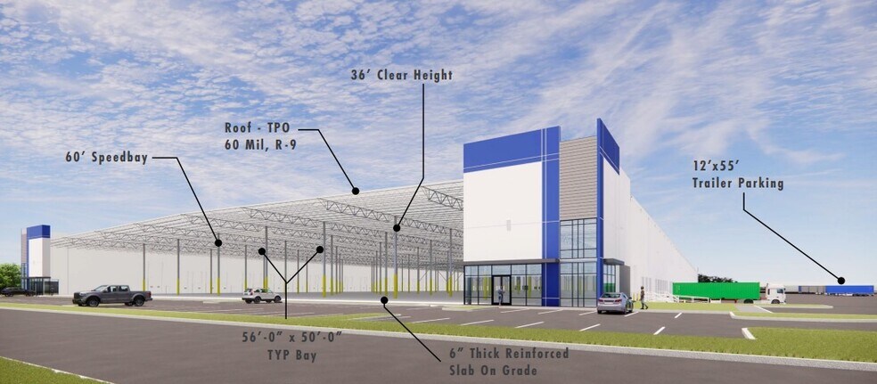 Trois bâtiments d'un parc d'affaires planifié de 697 618 pi2 inauguration au premier trimestre de 2025 offrant des espaces de 19 000 à 421 000 pi2.