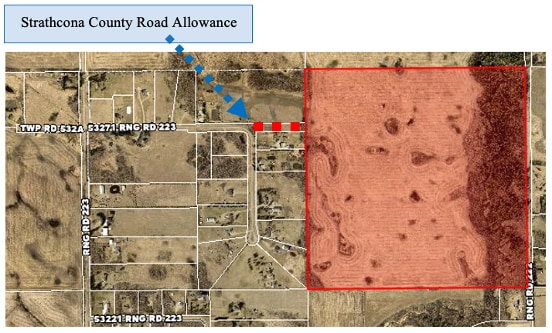 Situé à seulement ½ mille au nord de l'autoroute #16, du côté est du chemin Range 223 (3 milles et demi à l'est de la route 21). Le hameau d'Ardrossan est situé directement au sud de l'autoroute #16 par le viaduc Ardrossan par la route 222 pavée Range Road. Quart agricole parfait, terres détenues ou futur lotissement résidentiel de campagne. Offerrait des terres cultivées de qualité supérieure (actuellement louées à 85 $/acre utilisable). Le côté ouest de la propriété jouxte le lotissement résidentiel Queensdale Place Nord situé à côté de la limite sud de la région de Bremner. Bremner est une nouvelle expansion continue du parc Sherwood. Bremner sera une communauté complète répondant à une variété de besoins, y compris une gamme de types de logements, y compris des maisons individuelles, des appartements, une communauté piétonne et cyclable offrant des espaces ouverts et des espaces naturels, y compris les ruisseaux Pointe-Aux-Pins et Oldman, ainsi que des services communautaires, des écoles, des utilisations commerciales et de l'emploi. Du côté est de la propriété contenant le ruisseau Pointe-aux Pins se trouve une zone protégée Le ruisseau Pointe-aux Pins traverse une zone pittoresque le long du côté est de la propriété, où se trouvent un ravin et des épinettes centenaires. L'accès du comté désigné à la propriété se fait par l'entremise d'une allocation routière du comté de Strathcona qui n'a pas encore été améliorée (l'aménagement et le coût des améliorations sont assumés par le propriétaire foncier de la NE 15).