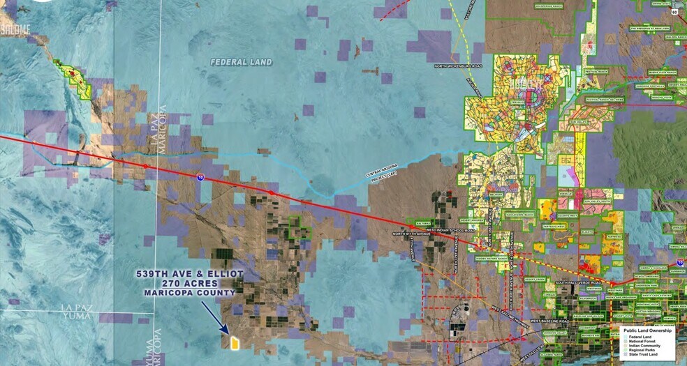 A 270-acre parcel in Western Maricopa County, Arizona, located at the southeast corner of 539th Avenue and Elliot Road, near the Maricopa and La Paz County line. Zoned RU-43, this land is well-suited for investment opportunities, future development projects or travel related uses.