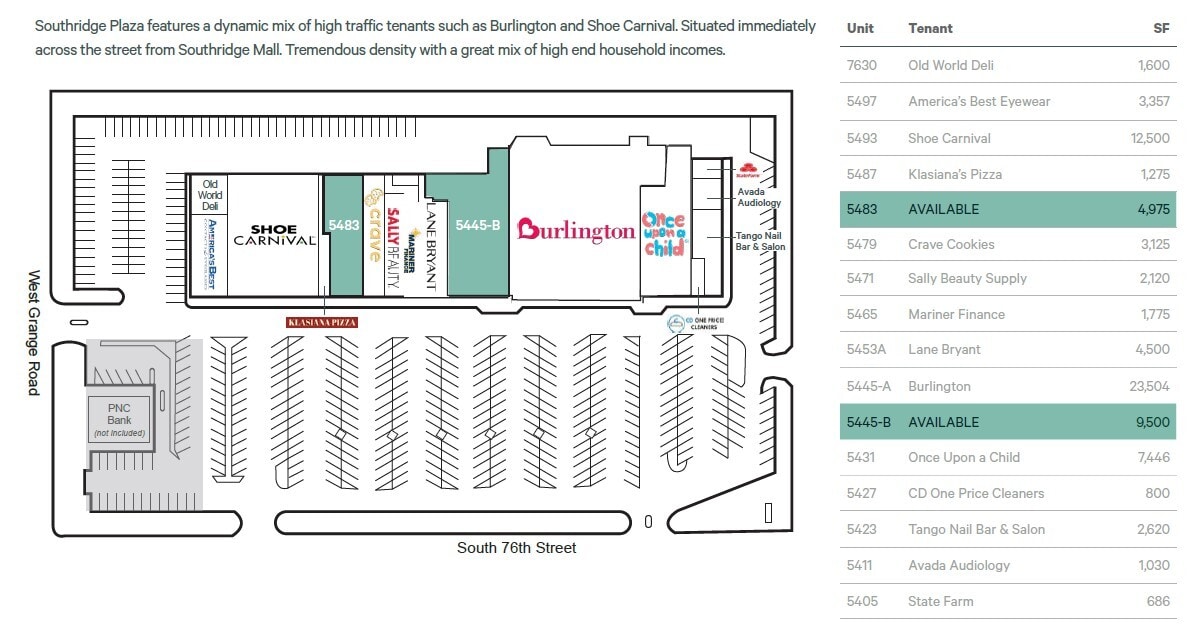 Southridge Plaza 5405-5497 S 76th St 4 975–14 475 pi² d'espace disponible • Commerce de détail • Greendale, WI 53129