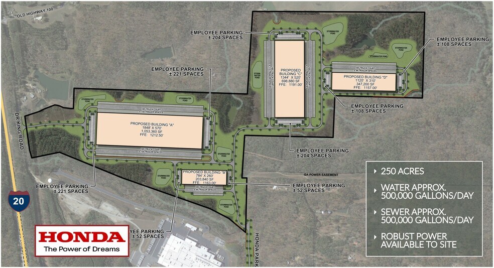The site is located in Haralson County, Georgia, near Interstate 20 and Old Highway 100, west of metro Atlanta. It offers utility infrastructure with significant water and sewer capacity and electrical service for industrial applications. Surrounding uses include an existing Honda manufacturing facility and other industrial developments. The region offers regional highway access for freight distribution across Georgia and neighboring states.