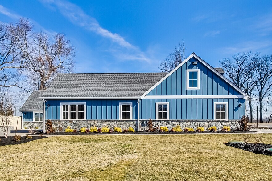 - Standalone stone and siding building with cottage-style design
