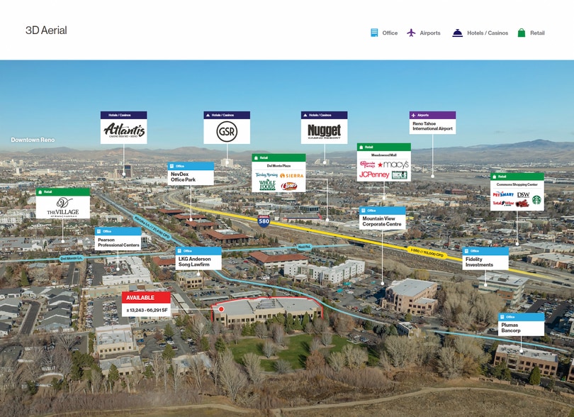 - Class-A office building - Anticipated $1MM exterior and interior renovations to be completed in 2026 - Close proximity to amenities including The Village at Rancharrah - Turn-key buildouts or TIA available for qualifying tenants - Various suite sizes and configurations available - Easy access from S. Virginia St. & Interstate 580 - Covered parking available - Building signage available - Adjacent to Anderson park & walking trails
