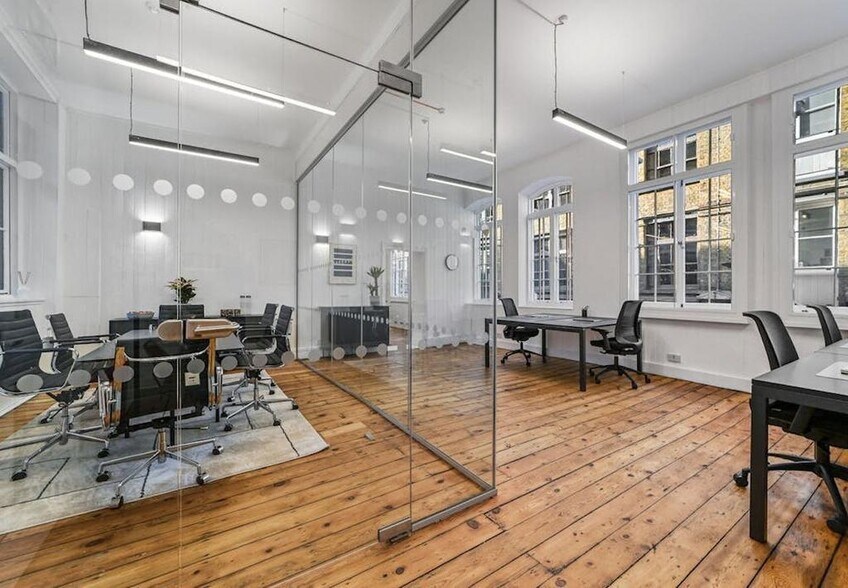 A beautiful top floor studio within a converted Victorian warehouse building. The space is full of character with loading style juliet balcony doors overlooking the cute cobbled rear of Charlotte Road, original timber floors, exposed brickwork and an impressive pitched timber roof with exposed joists. The floor benefits from being open plan with existing glazed meeting room, the current furniture can be included subject to separate negotiation.