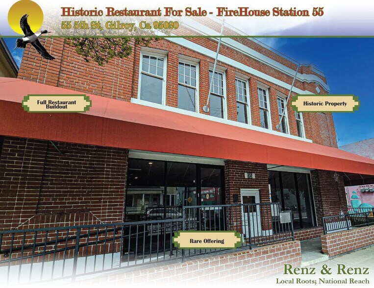 Également offert à la vente pour 1 645 000 $ avec options de financement par le vendeur ! Découvrez une opportunité d'investissement vraiment unique au 55 5th Street, au cœur du centre-ville historique de Gilroy. Cet immeuble en briques, autrefois la caserne de pompiers de la ville, a été transformé et utilisé comme espace de restauration dynamique pendant des décennies, mais reste prêt à accueillir une nouvelle vision inspirée. À l'intérieur, la propriété déborde de caractère et de fonctionnalité. Une cuisine commerciale complète, deux bars, deux unités de réfrigération à accès direct, trois salles de bain et plusieurs espaces de restauration offrent une multitude de possibilités culinaires. Les clients peuvent savourer leurs repas ou leurs boissons en plein air grâce aux espaces extérieurs situés au premier et au deuxième étage, apportant une énergie vibrante au paysage historique du centre-ville. Les investisseurs apprécieront l'équilibre entre le charme historique et les améliorations pratiques, notamment un nouveau toit TPO garanti, installé en février 2025, assurant une résistance aux intempéries, tandis que les renforts structurels précédents offrent une tranquillité d'esprit à long terme. Avec un stationnement abondant à proximité et un prix inférieur à la valeur estimée en raison de son état, cette propriété offre un potentiel significatif pour ceux prêts à redonner vie à un monument local apprécié. Située à 40 km au sud de San Jose avec un excellent accès aux autoroutes, Gilroy est une communauté florissante de plus de 58 000 résidents, avec un âge médian de 36 ans, un revenu médian des ménages de 131 554 $ et une valeur médiane des propriétés de 975 800 $. La ville est envisagée comme un futur arrêt pour le train à grande vitesse reliant San Francisco à Los Angeles. Réputée pour son Festival de l'Ail, ses Gilroy Premium Outlets, son parc d'attractions Gilroy Gardens Family Theme Park, et son accès à plus de 20 vignobles et salles de dégustation le long du Santa Clara Valley Wine Trail, Gilroy continue de croître et d'attirer de nouvelles opportunités. Saisissez cette chance d'investir dans la renaissance du centre-ville de Gilroy et de créer une destination inoubliable au 55 5th Street.