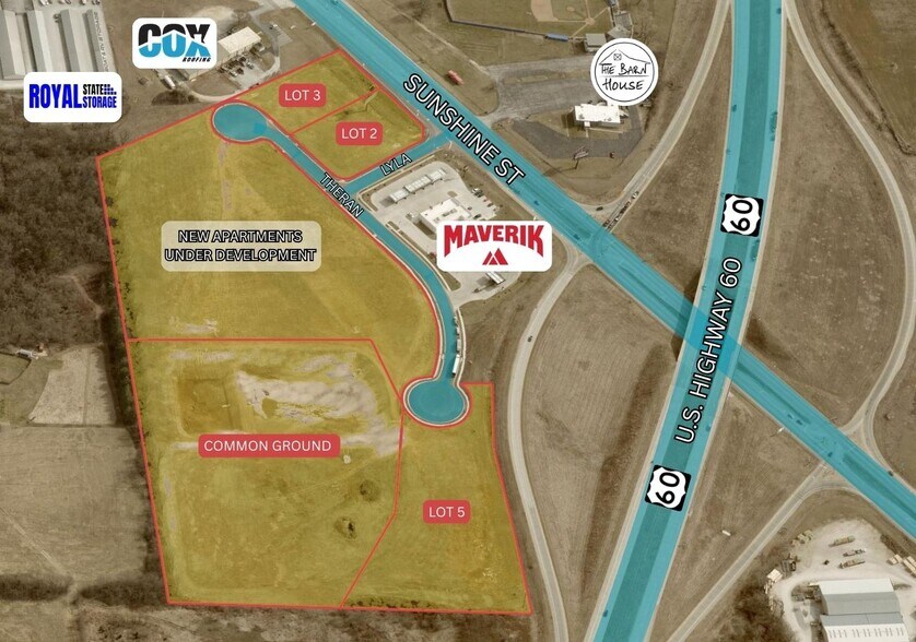 Cette propriété de 13,95 acres ± acres est située à Springfield, juste au nord-ouest de l'intersection de l'autoroute de la rivière James (US-60) et de Sunshine. Les entreprises environnantes comprennent l'installation de distribution et d'entreposage STL3 d'Amazon de 1,3 million de pieds carrés, Cox Roofing Co, The Barn House Event Center, Buddy's Auto Mall and Salvage, Blevins Asphalt, Royal-State Storage et plus d'entreprises locales et nationales. Lee McLean III, SIOR, CCIM est conseiller principal pour SVN Commercial dans la région métropolitaine de Springfield Missouri. Lee détient la désignation CCIM & SIOR, une licence immobilière de courtage associé et se classe parmi les 3 % supérieurs de SVN International.