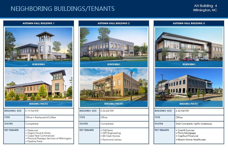 ± 33 041 pieds carrés louables disponibles pour la location préalable dans un immeuble à bureaux de classe A de deux étages situé à Autumn Hall, un projet d'aménagement mixte de 236 acres situé sur le chemin Eastwood, dans le sous-marché Landfall/Mayfaire de Wilmington, en Caroline du Nord. En plus des maisons unifamiliales résidentielles et multifamiliales, Autumn Hall comporte une composante commerciale et de nombreux aménagements extérieurs, dont près de 51 acres de parc/espaces verts et sentiers pédestres. Une fois terminée, la communauté de jeux en direct comptera environ 486 844 pieds carrés de commerces de détail, 355 090 pieds carrés de bureaux de classe A et 130 000 pieds carrés de locaux d'hôtel/restaurant soutenus par plus de 1 210 144 pieds carrés de résidences. Veuillez vous renseigner pour obtenir des détails sur le tarif de location.