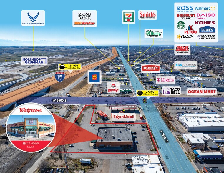 The approx. 13,650 SF building on large 2.24-acre parcel is positioned on the hard-corner, signalized intersection of S 1900 W and W 5600 S, which sees a combined traffic count exceeding 77,700 VPD and is directly adjacent to I-15 (over 131,000 VPD), Utah’s busiest thoroughfare. The subject property is across from Northrup Grumman’s new $148 million facility – Roy Innovation Center—which is equipped with state-of-the-art technology and resources for development, testing and integration of missile systems to support the $140 billion Sentinel Missile Program. Northrop Grumman is the largest defense employer in Utah with over 10,000 direct employees, supports more than 46,000 jobs and generates over $12 billion for the state’s economy. Hill Air Force Base, the second largest Air Force base by population and size, lies across from the subject property and is the largest single-site employer in Utah which supports a total workforce of ~27,000, including over 5,600 active-duty members and more than 14,000 government civilians.