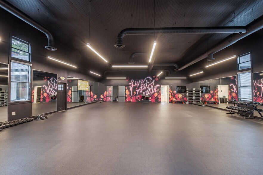 Suite 2 is the focal point of the building. Currently configured as a gym, the space can be repurposed for a variety of uses. 15.5' ceiling height. 42' wide x 72' deep.