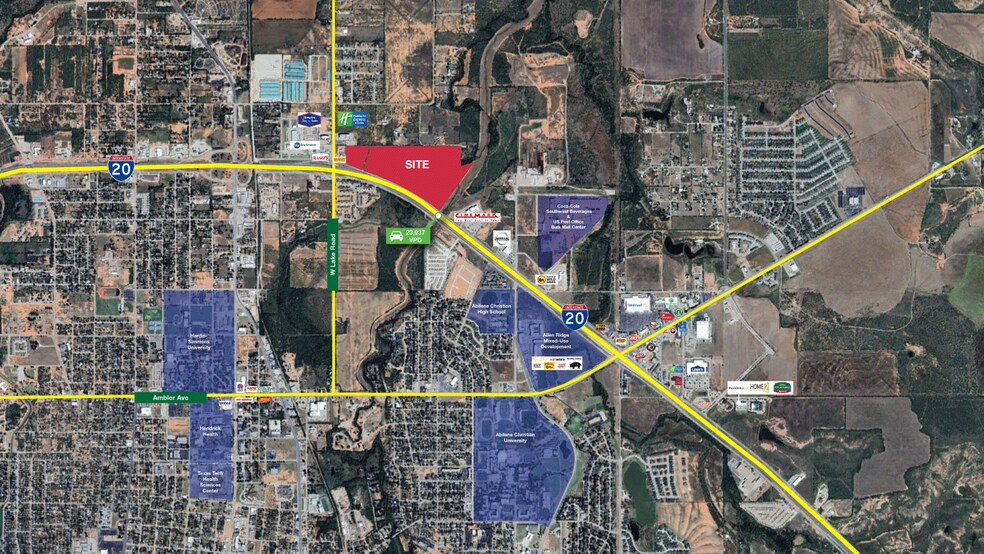 Positioned on the north side of I-20 just west of Lake Road/FM 600, this 64.72-acre tract offers outstanding visibility and prime highway frontage. Zoned GC, the property is an open, development-ready site surrounded by major industrial, manufacturing, and retail uses—including Cinemark, Walmart, Lowe’s, and more. Located near Abilene Christian University and the rapidly growing Allen Ridge Development, this site sits directly in the path of North Abilene’s continued expansion. An excellent opportunity for a wide range of commercial development.