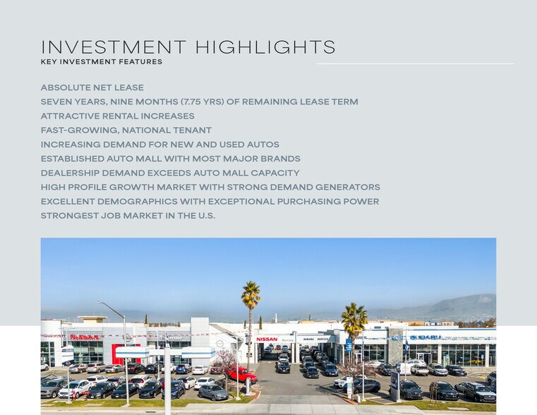 This Property is centrally located in the East Bay submarket with excellent access to Oakland/East Bay and San Jose/ South Bay via Interstate 880, and Silicon Valley via the CA-84 Dumbarton Bridge. The Property is located in the Fremont Auto Mall which offers most major brand auto dealerships including Mercedes Benz, BMW, Lexus, Porsche, Acura, Toyota, Honda, Hyundai, Chevrolet, Cadillac, Buick, and GMC. Premier Automotive Center delivers a strong current yield with built-in rental increases over the lease term extending 7+ years.