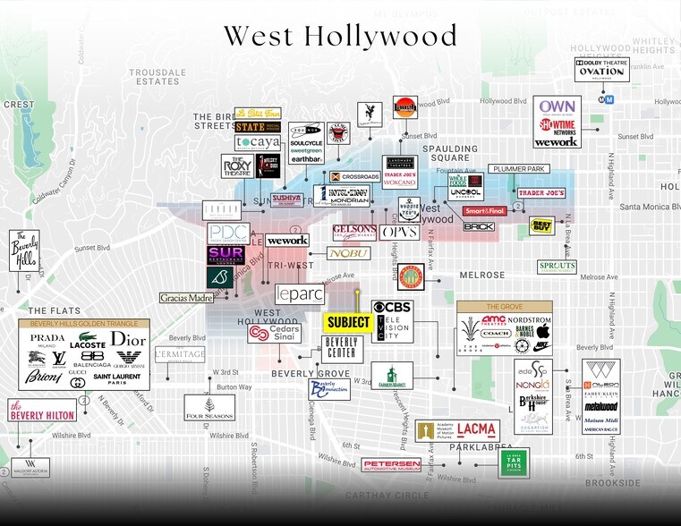 Nearby Attractions & Hot Spots: Melrose Place Alfred Coffee, Catch Steak, Nobu, The Row, CASSELLA, Violet Grey, Cucina Alba, Drake's, Craig's, West Hollywood Design District luxury showrooms, flagship fashion houses, art galleries, The Grove & Original Farmers Market, Beverly Center & Beverly Connection, Sunset Strip iconic hotels, entertainment venues, premier nightlife, Cedars-Sinai Medical Center - Ranked #1 Hospital in California, Top 10 in U. S. Major employers and creative office hubs across West Hollywood, Beverly Hills & Miracle Mile.