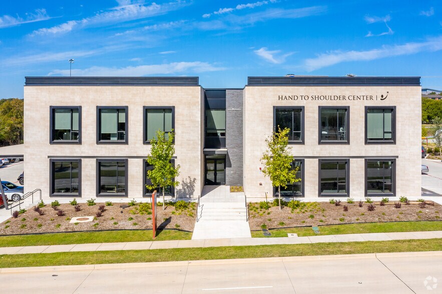 Cabinet médical à Clearfork. Immeuble à locataires multiples de deux étages avec chirurgiens orthopédistes au deuxième étage. Le premier étage comprend un groupe de pratique de soins primaires et de médecine interne et un espace de physiothérapie et d'ergothérapie.