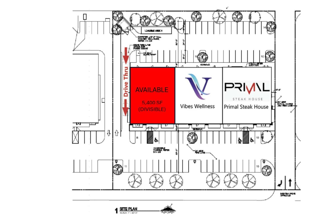 Up to ±5,400 SF with Drive-Thru Available (divisible). Ideal for QSR, coffee, bakery, fast-casual, or medical user. Asking rates: $49/psf + NNN for the drive-thru end cap; $36/psf + NNN for the in-line space.