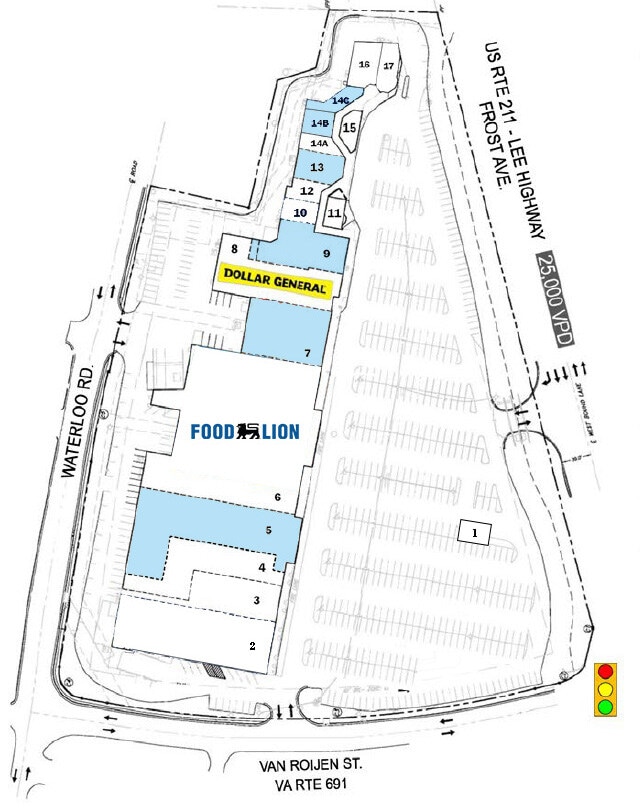 Warrenton Towne Centre offers retail space for lease in a highly visible location along Frost Avenue (Route 211) in the Town of Warrenton, part of the Washington, DC MSA. The center benefits from a signalized intersection with traffic counts exceeding 25,000 vehicles per day and a dedicated turning lane for easy access. Positioned near a 97-bed regional hospital, Fauquier High School, and multiple government offices, the property is in a strong growth corridor with expanding residential development. The center features a diverse tenant mix including Food Lion, Harbor Freight Tools, Dollar General, and several service-oriented businesses, creating a steady draw of daily traffic. Over 500 surface parking spaces provide convenience for customers and employees. Public transit lines serve the property, enhancing accessibility for the surrounding community. Available spaces range from small-format suites to larger footprints, accommodating a variety of retail concepts.
