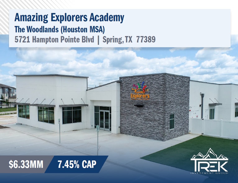 TREK Investment Group is pleased to offer Amazing Explorers Academy (AEA) The Woodlands in Spring, Texas (Houston MSA) situated in the highly sought-after affluent community of The Woodlands with this location boasting a $151,1190+ Average Household Income within 5 miles of the property and conveniently located just 30 miles from Downtown Houston and 30 minutes from George Bush Intercontinental Airport. AEA offers an investor an incredible opportunity to acquire a property featuring a brand-new Absolute NNN 15-year lease with zero landlord responsibilities and scheduled rent increases.