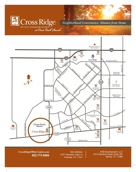 Welcome to Cross Ridge Office Condominiums at Cross Creek Ranch, a new professional office community being developed by SHB Development. Cross Ridge Office Condominiums provide a unique opportunity to grow your business against the backdrop of two of the fastest growing master-planned communities in the nation: Cross Creek Ranch and Cinco Ranch – an ideal location for business professionals who are ready to serve their community and work close to home. Our community is ideal for professionals who are looking for office space with front-door, walk-up access and surface parking for customers. Whether you need 1,200 or up to 4,900 square feet, Cross Ridge Office Condominiums offer an easy, affordable way to own or lease office space. Each building offers four units with flexible and efficiently designed space that can be combined to accommodate your needs. Located in Fulshear, Texas just west of Katy along FM 1463, a fast-growing corridor with easy access to I-10, the new Grand Parkway, and the Westpark Tollway.