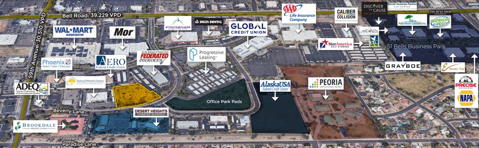 • Les utilisations possibles comprennent le libre-entreposage, le cabinet médical, l'aide à la vie autonome, l'école • Intersection à fort trafic : ± 70 000 véhicules par jour • Fait partie du Talavi Corporate Center à Glendale • Les entreprises voisines comprennent : Delta Dental de l'Arizona, Progressive Finance, Redlex Traffic Systems, California Casualty, Alaska, États-Unis Federal Credit Union, CSAA Insurance, Phoenix Heart & Cardiology, John C. Lincoln Medical Services et Credit Union West • Personnel de 1,3 million de personnes et proximité de cinq collèges (Thunderbird School of Global Management, Midwestern University, Arizona State University West, DeVry University, Glendale Community College)