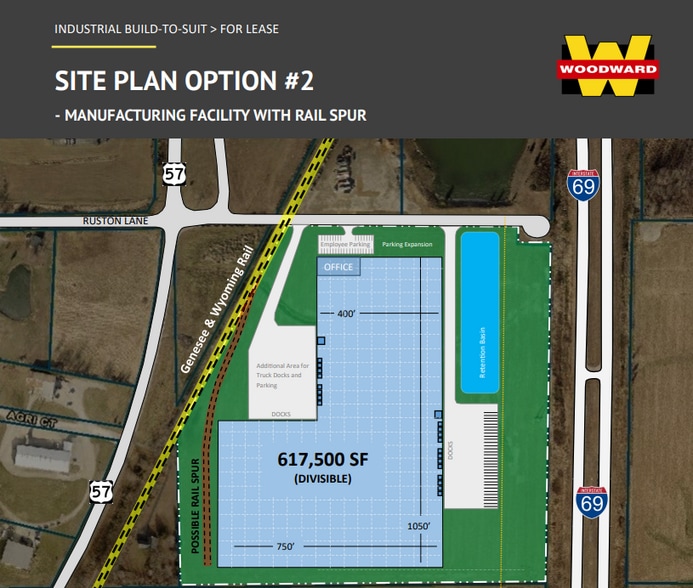 Cette propriété industrielle desservie par chemin de fer fait face à l'autoroute I-69 et est prête pour un service personnalisé installation à construire pour une entreprise à la recherche de 300 000 à 617 500 pi2 avec la quantité idéale d'espace d'entreposage et de bureau, de quais, de stationnement des employés, capacité d'agrandissement, stationnement des remorques, hauteur du plafond, puissance, etc. La période de construction est d'environ 9 à 12 mois. Pour plus de l'information sur Woodward Development, veuillez visiter — https://www.woodwardrealty.com/development. Spécifications proposées : - 300 000-617 500 PC - Construction en acier préfabriqué - ± 37 acres - Construction de bureaux de 1 000 SF - Hauteur claire 32 pi avec espacement des colonnes de 50 pi x 50 pi - ± 30 places de stationnement pour les employés - 12 quais avec équipement - 2 portes au volant - Option pour l'épi - Système de gicleurs ESFR - Zoné M-2 Les spécifications ci-dessus doivent être modifiées selon les besoins des locataires. Voir la brochure pour plus de détails ou communiquer avec l'agent pour des questions et des prix personnalisés. Les taux demandés sont fondés sur une durée de bail de 15 ans. Le tarif pour une période de location de 10 ans est disponible sur demande.
