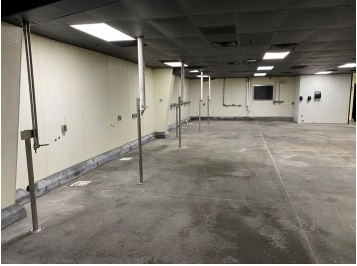 Fully climate controlled building set up for food production with washable walls/ceiling tiles, a clean-out area, and floor drains. The office includes a coffee bar, and there is an employee break room in the warehouse.