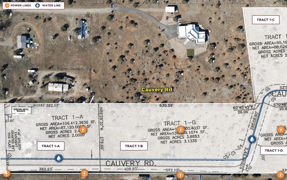 Anchoring the first parcel is a 2,500 SF clear span warehouse/shop with dual 12’ x 12’ drive-through doors, 12’–13’ clear height, and single-phase power — perfect as a development staging facility, contractor headquarters, or interim income use while the balance of the acreage is positioned for its highest and best use. Cauvery Land is an East Mountain development canvas with infrastructure groundwork already in place and the upside still ahead.