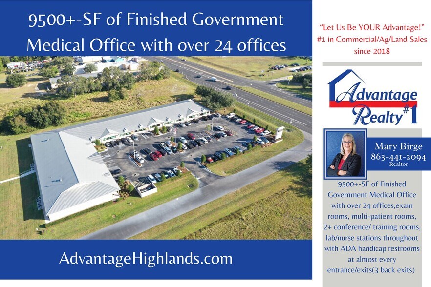 9500+-SF of Finished Government Medical Office with over 24 offices,exam rooms, multi-patient rooms, 2+ conference/ training rooms, lab/nurse stations throughout with ADA handicap restrooms at almost every entrance/exits(3 back exits) Main Entrance in middle front with two private entrances(one at each end. Large open parking area with prominant Marque/ digital sign at median turn US 27 for easy access, well designed / maintained multi-unit office facility with hurricane/ impact resistant windows, standing seam metal roof. Anchor tenant is Heartland Career Source at end of parking lot, VA Clinic recently moved out of this subject 9500sf to newly built/ owned facility. With additional room to expand to neighboring units as well.