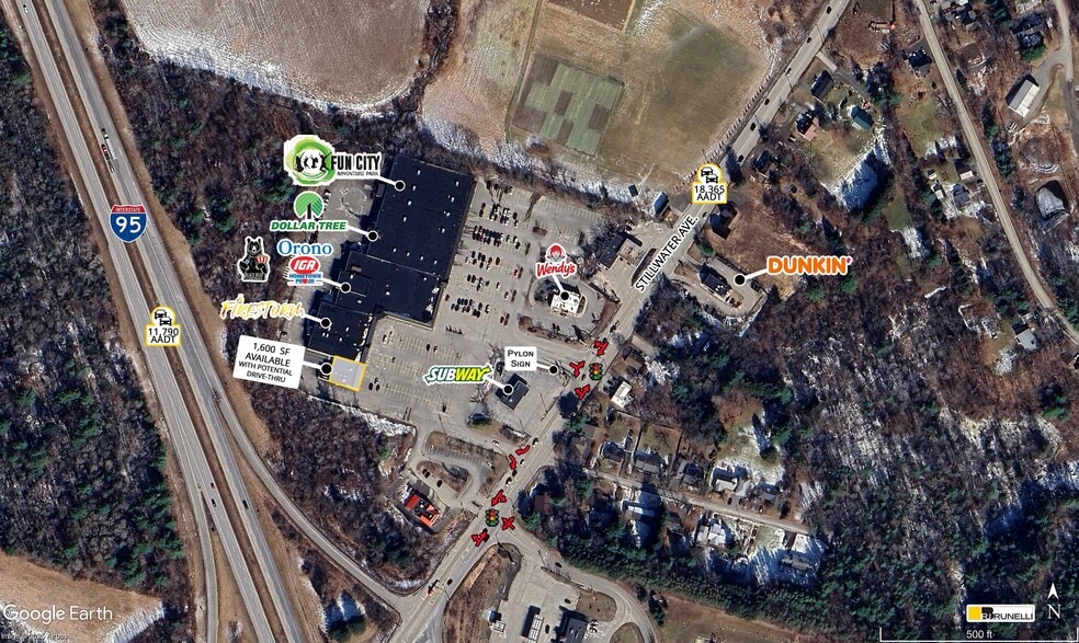 Le centre commercial University Mall est situé à un feu de circulation sur Stillwater Avenue, à seulement quelques secondes de l'autoroute I-95. Ces deux routes enregistrent ensemble un débit quotidien de 30 155 voitures, garantissant une grande visibilité et un accès facile pour les clients.