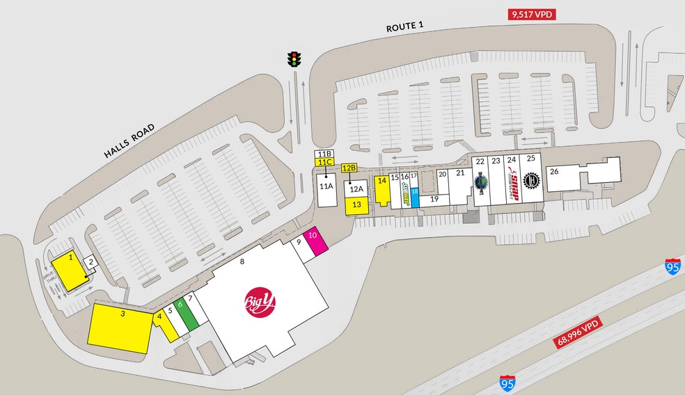 Old Lyme Marketplace is a 102,500± SF grocery anchored shopping center located on the heavily traveled Route 1 in Old Lyme, CT. Situated immediately off exit 70 on Interstate 95 (±68,996 vehicles per day), the property sits in the heart of the primary trade corridor at a signalized intersection on Route 1 (±9,500 vehicles per day). Anchored by Big Y World Class Market, one of the region’s premier supermarkets, the center draws a mix of national, regional, and local tenants. The center has 584 dedicated parking spaces for customers and employees.