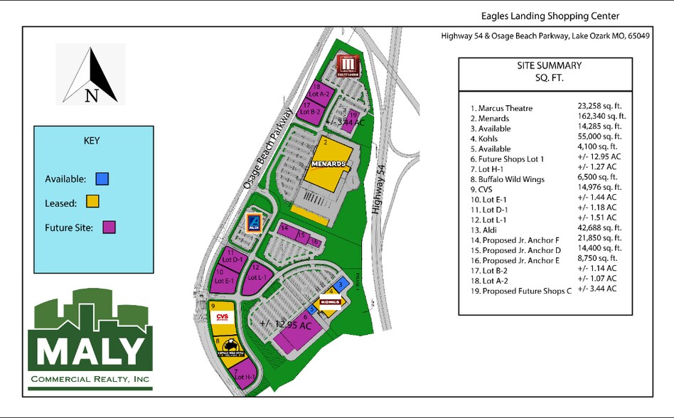 Occasion de location foncier au centre commercial Eagles Landing en pleine expansion situé au lac Ozark, près de l'autoroute 54 (10 919 AADT) et de la promenade Osage Beach (8 144 AADT), offrant un nombre élevé de trafic quotidien et une grande visibilité depuis l'autoroute. Ancré par Mendard, Kohl et d'autres locataires mixtes. En 2020, le lac des Ozarks a accueilli plus de 9,13 millions de visiteurs de partout aux États-Unis.