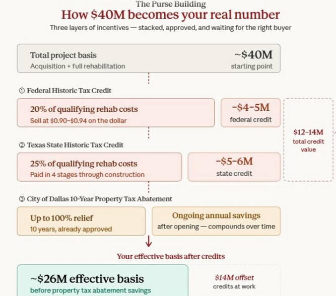 - City of Dallas Property Tax Abatement – 10-year approved historic abatement, up to 100% relief.