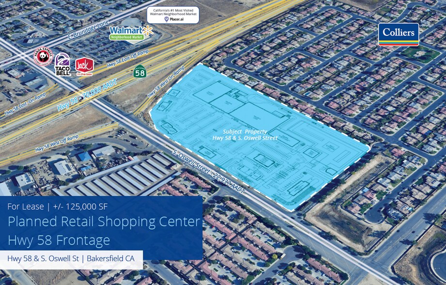 L'intersection de l'autoroute 58 et de la rue S Oswell propose le développement d'un nouveau centre commercial d'environ ±125 000 pieds carrés, offrant des opportunités de location pour des magasins principaux, des magasins secondaires, des terrains en bail foncier, une station-service, un lave-auto, des boutiques et des restaurants. Situé dans un marché de détail sous-desservi à l'est de Bakersfield avec une forte demande commerciale, ce projet vise à attirer une large gamme de locataires.