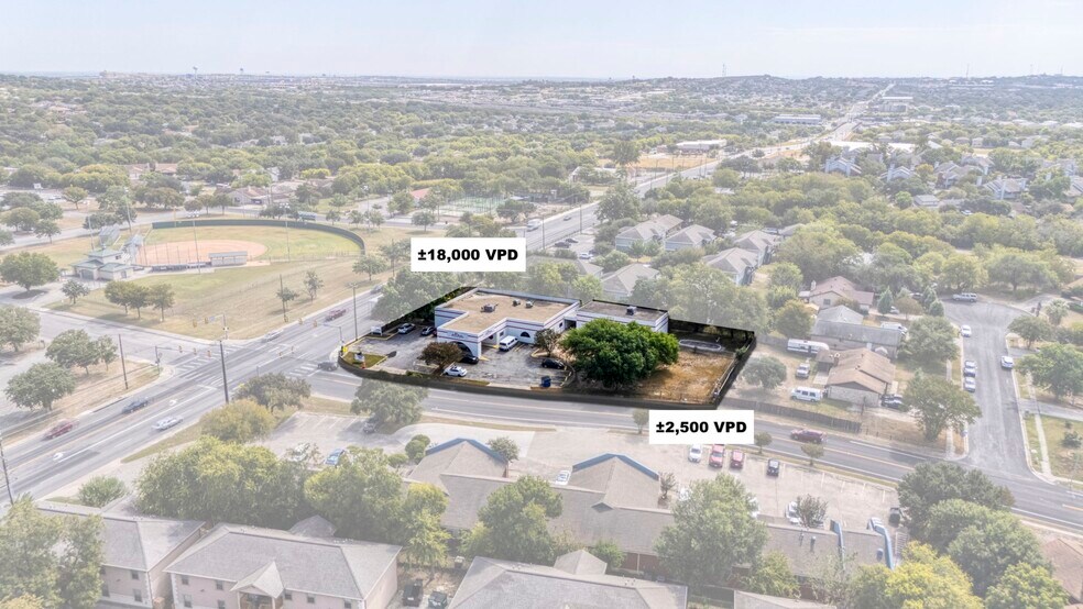 Freestanding commercial opportunity situated on approximately 0.80 acres at a signalized hard corner with exposure to ~20,000 VPD, directly across from Woodstone Elementary School and near neighborhood-serving businesses. Existing improvements and plumbing-intensive buildout make the property well-suited for a variety of uses including medical office, urgent care, dental, therapy/rehab, educational, daycare, church/non-profit, or other service-oriented users. Site circulation may also support FSER (Free standing Emergency Room) or other high-traffic healthcare concepts. Convenient access to Loop 1604, I-35, and IH-10 provides strong connectivity to Northeast and North Central San Antonio. Property is currently zoned C-2, with nearby corners supporting more intensive commercial use, making this a strong adaptive reuse or long-term commercial location.