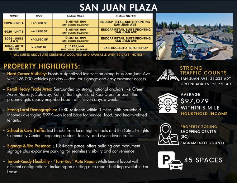 San Juan Plaza offers flexible retail and automotive leasing opportunities at a highly trafficked intersection in Citrus Heights. The property features endcap retail suites fronting San Juan Avenue with the ability to lease individually or combine for a larger footprint, alongside a standalone auto repair building suitable for immediate operation. Positioned within an established shopping corridor, the site benefits from strong daily traffic counts, visible frontage, and a dense surrounding residential base. All spaces are currently occupied and available with 30 days’ notice, allowing for near-term occupancy while maintaining income continuity. The center’s layout, signage, and parking support a wide range of retail, service, and automotive uses seeking exposure and accessibility in a proven trade area.