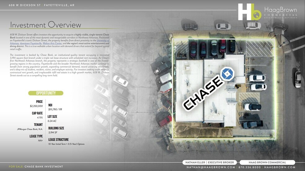 The investment is backed by Chase Bank, an institutional-quality tenant occupying a renovated 3,194-square-foot branch under a triple-net lease structure with scheduled rent increases. As Chase's first Northwest Arkansas branch, the property represents a strategy foothold in one of the fastest-growing regions in the country. Fayetteville and the broader Northwest Arkansas market continue to benefit from strong population growth, expanding commercial demand, record university enrollment, and a deep mix of student, resident, visitor, and employer activity. For investors seeking credit tenancy, contractual rent growth, and irreplaceable infill real estate in a high-growth market, 608 W. Dickson Street stands out as a compelling long-term hold.