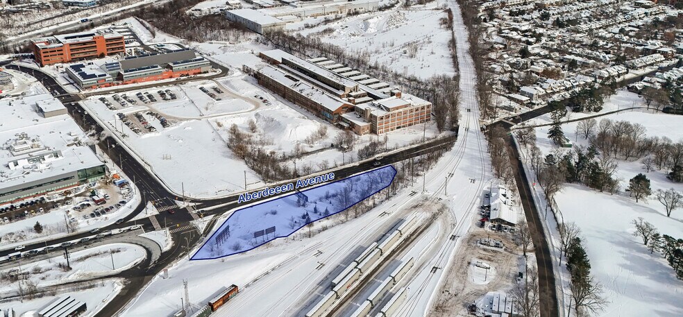 La propriété est un terrain de 1,28 acre situé au 611 Aberdeen Avenue à Hamilton, Ontario. Elle bénéficie d’un zonage M4, qui autorise des usages industriels ainsi que des activités de soutien pour les parcs d’affaires. Le site offre un accès à l’autoroute 403 et à la QEW, et comprend actuellement deux panneaux publicitaires installés. Il est adjacent à des lignes ferroviaires et se trouve à proximité de divers services commerciaux, notamment des restaurants à service rapide et des institutions financières, avec des grandes artères à proximité immédiate.