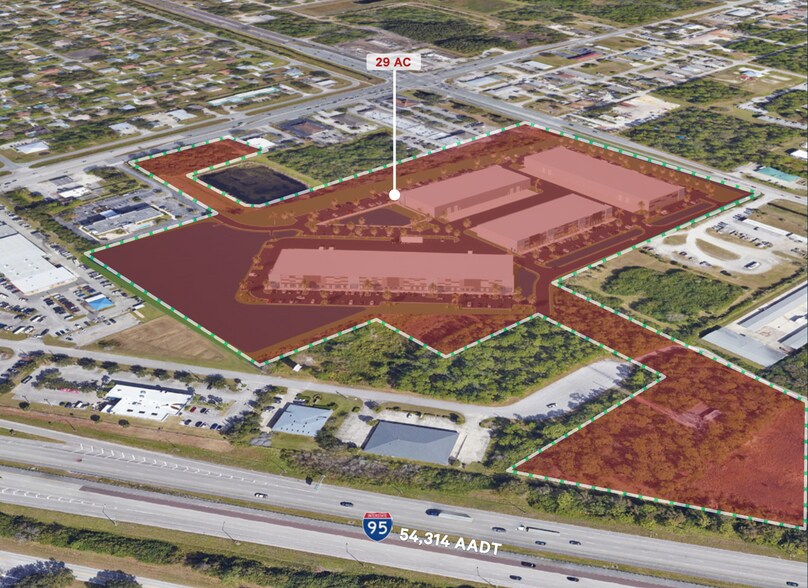 This 30-acre spot in Palm Bay, right at Malabar Road and Babcock Street, is primed for flex or light industrial builds, with ready concepts over 200,000 SF plus an out parcels. Flat terrain and stable sandy soils make foundations straightforward based on the 2022 geotech report, with a clean Phase I ESA showing no major environmental red flags, low flood risk in Zone X, and just minor wetlands needing basic mitigation. It's under a half mile from I-95, pulling in 55,000+ vehicles daily on Malabar for solid visibility and access.